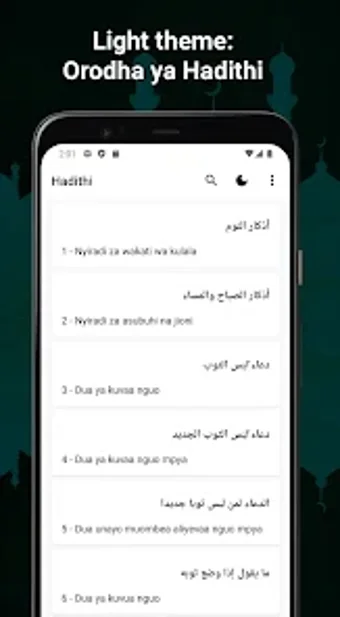 يقدم التطبيق واجهة مستخدم بسيطة، مما يجعل التنقل والعثور على الحديث المطلوب سهلاً. الأحاديث متاحة باللغة السواحيلية، مما يجعلها متاحة للمسلمين الناطقين بالسواحيلية. من خلال هذا التطبيق، سيتمكن المستخدمون من الوصول إلى مجموعة واسعة من الأحاديث التي يمكن قراءتها للحصول على الإلهام والتوجيه اليومي.